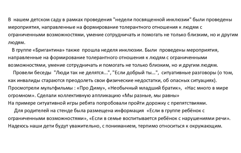 С 04.04.2022 по 08.04 2022 в нашем саду проходила неделя инклюзивного образования "Разные возможности-равные права". Неделя инклюзивного образования в ДОУ проводится ежегодно с целью создания условий для детей с ограниченными возможностями здоровья, привлечение внимания родителей к проблеме социализации ребенка с ограниченными возможностями здоровья в социуме, а также просветительская работа с родителями, педагогами и всеми работниками дошкольного заведения по вопросу инклюзивного образования.