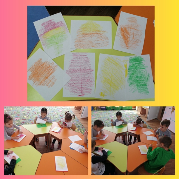 А листочки, собранные детьми на прогулке, использовали для создания рисунков в нетрадиционной технике "Фроттаж".