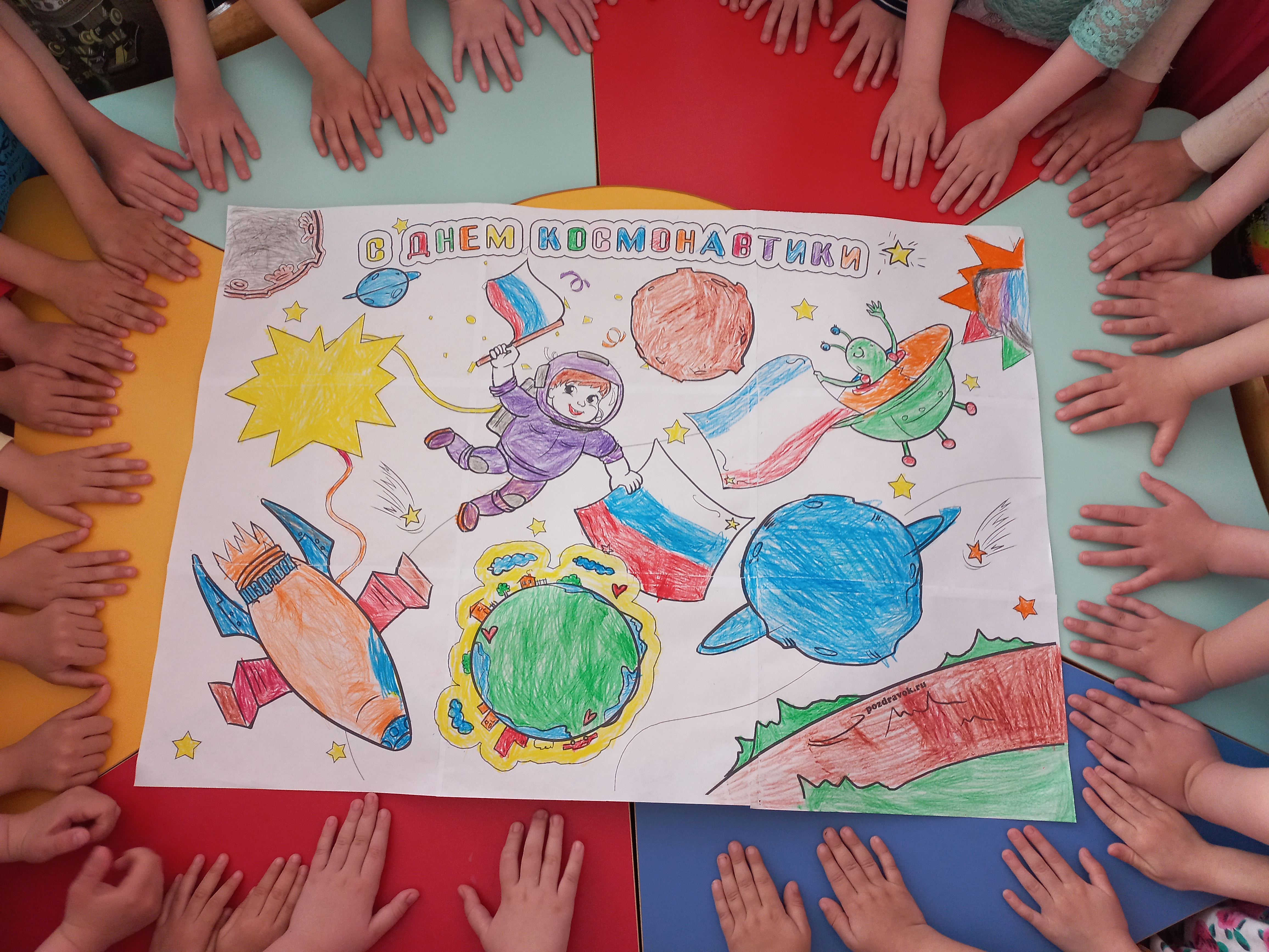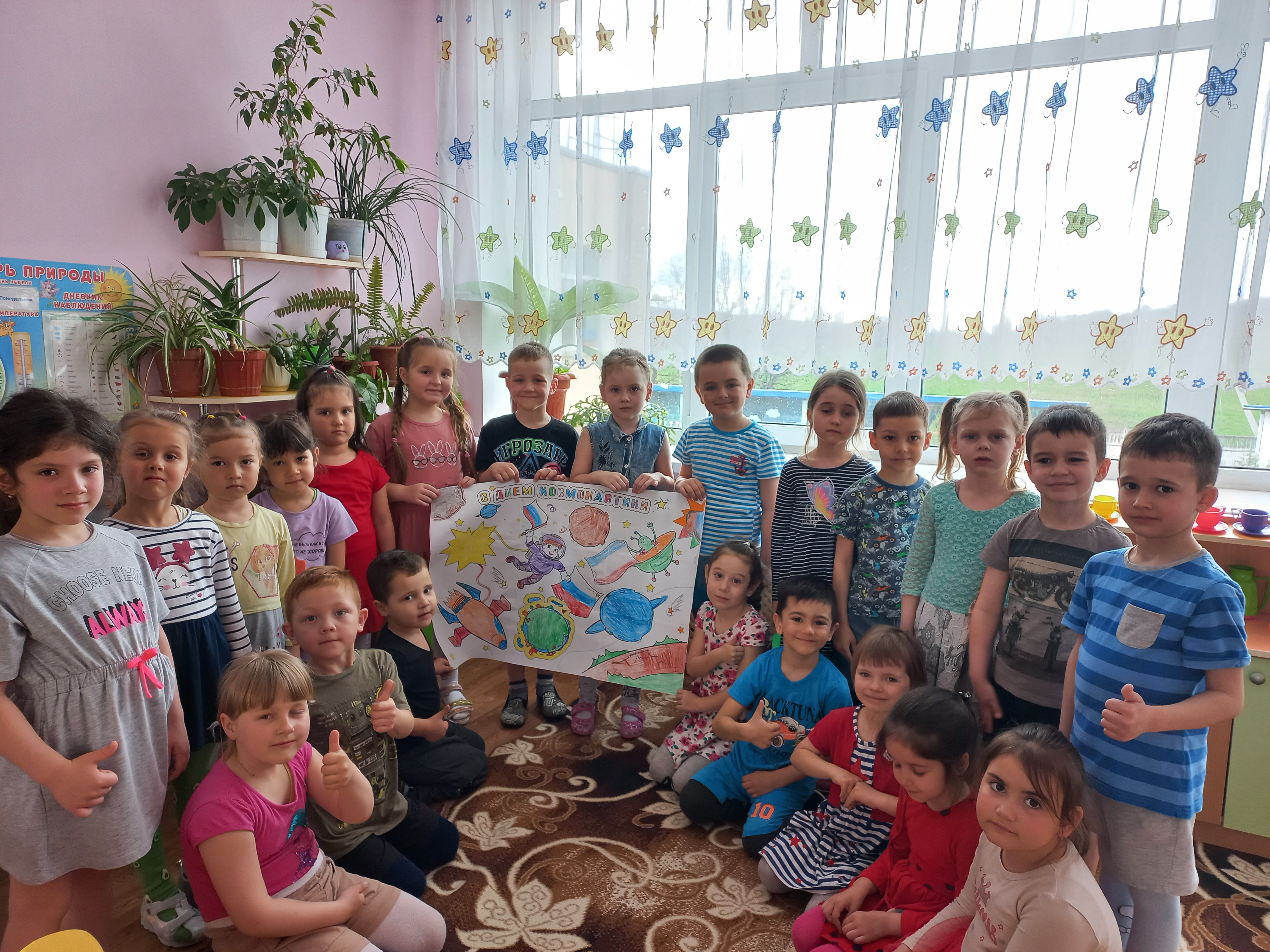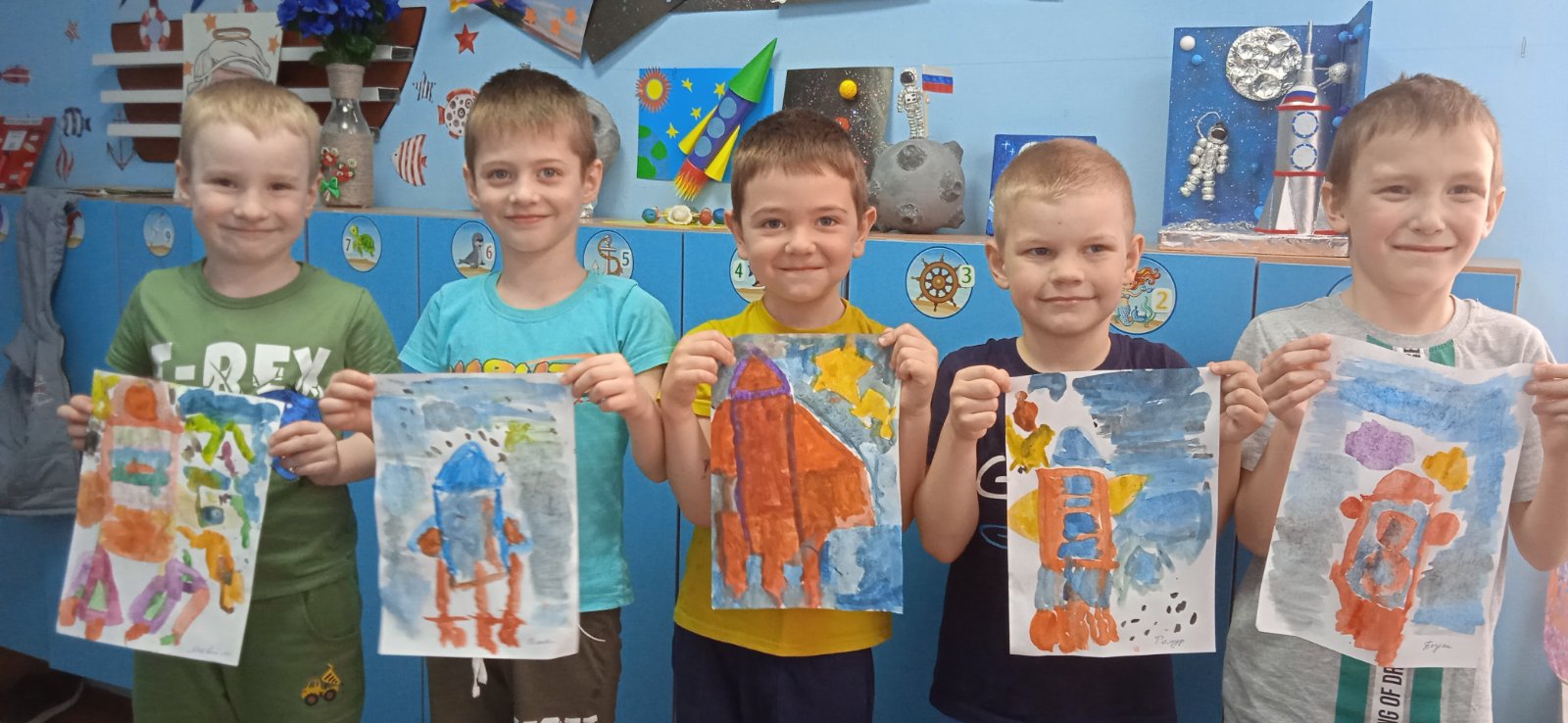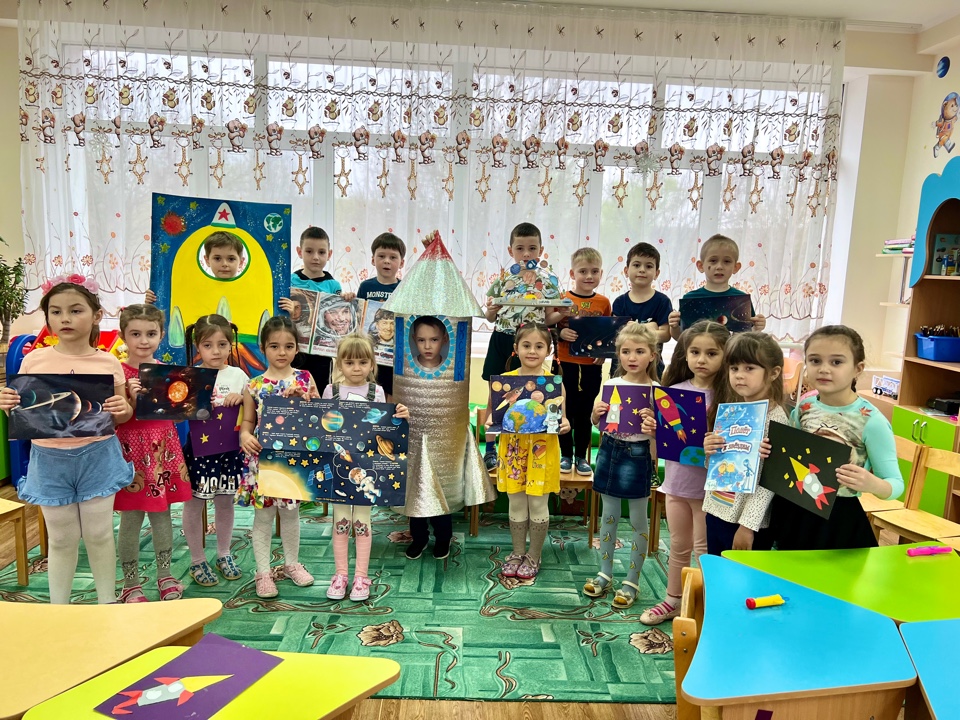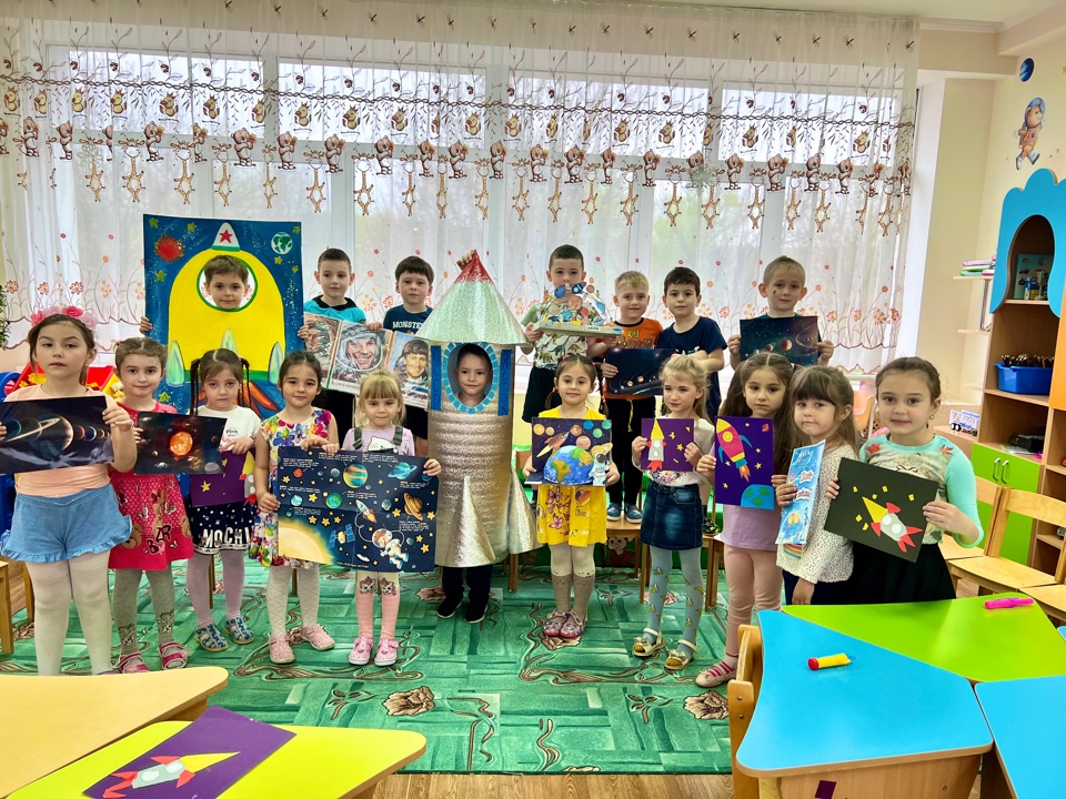 Дети с удовольствием отправились в космическое путешествие, участвовали в различных эстафетах и обратно вернулись в детский сад. Во всех группах детского сада эта тема красной нитью проходила во всех режимных моментах: "космическая зарядка", "Завтрак космонавта", "Гагаринский урок", "космические прогулки, игры, рисунки, плакаты, полеты в космос".