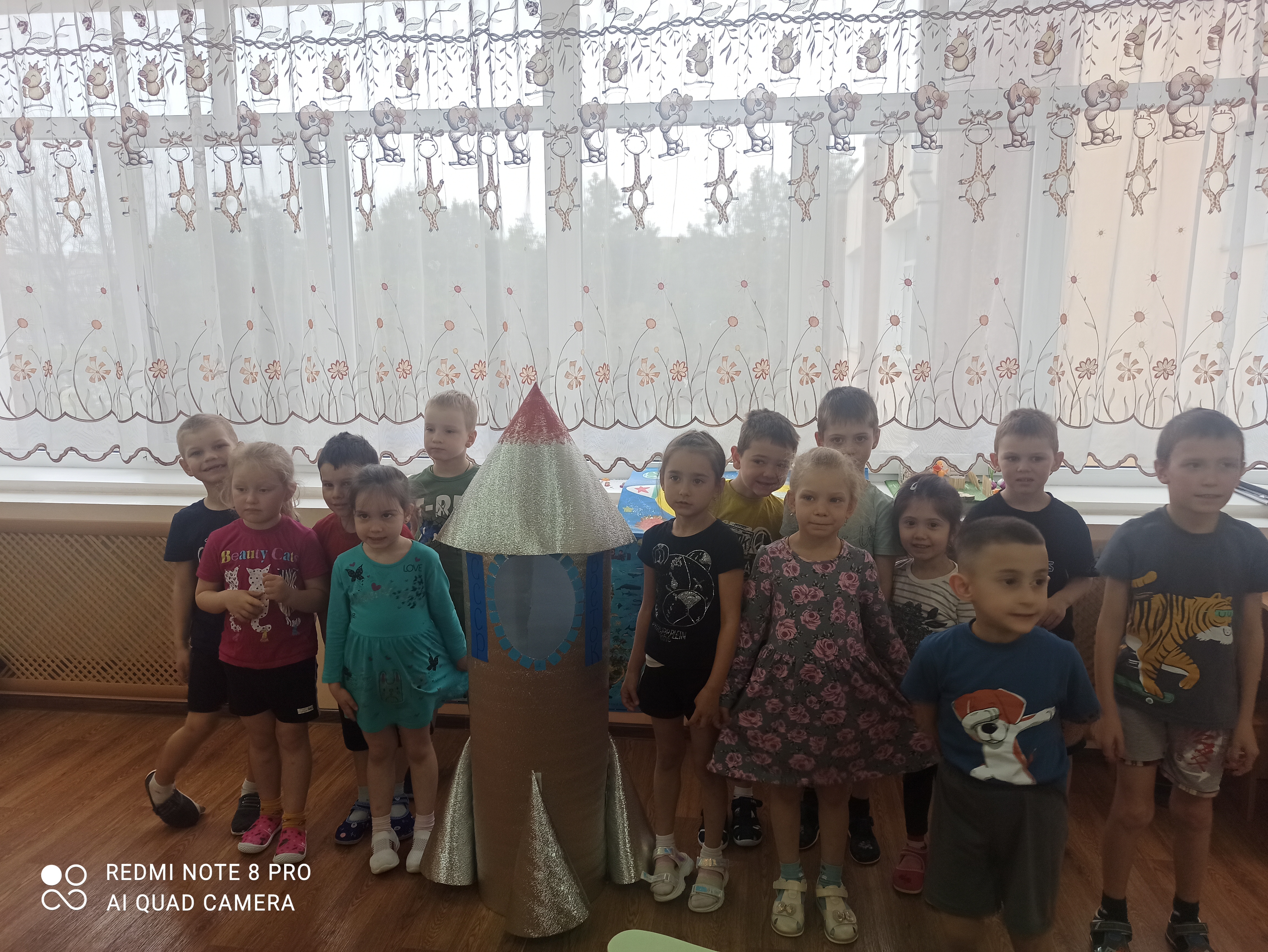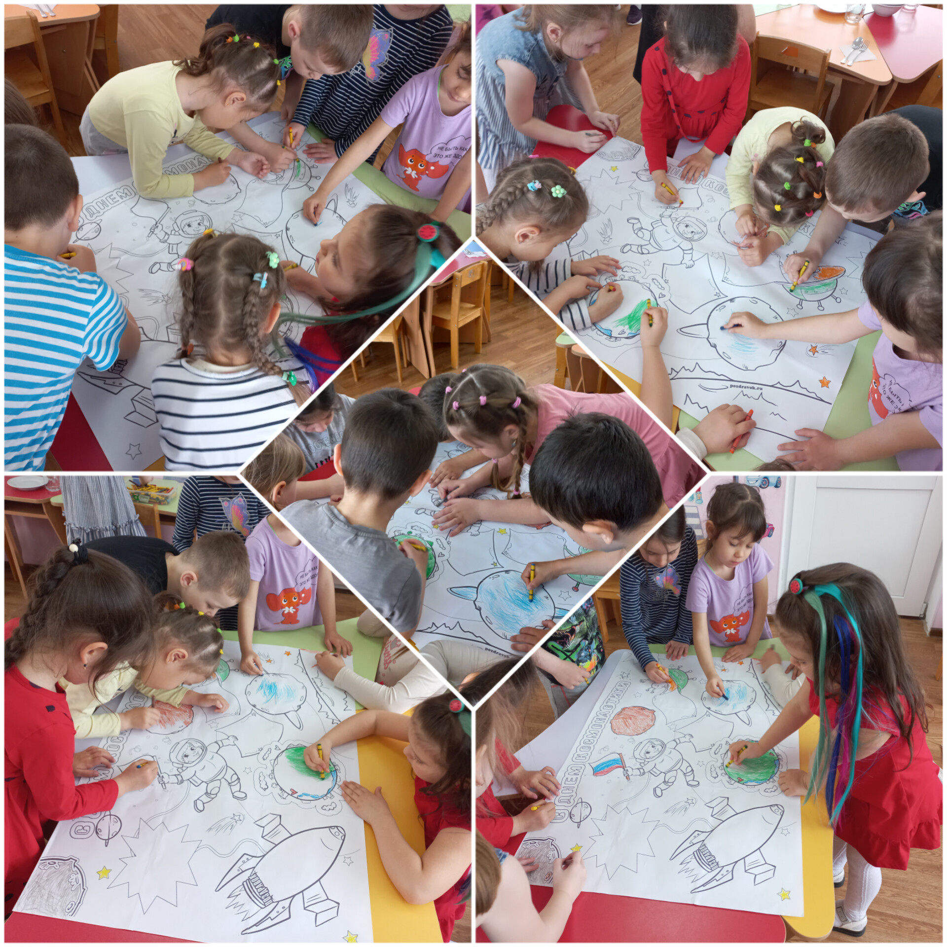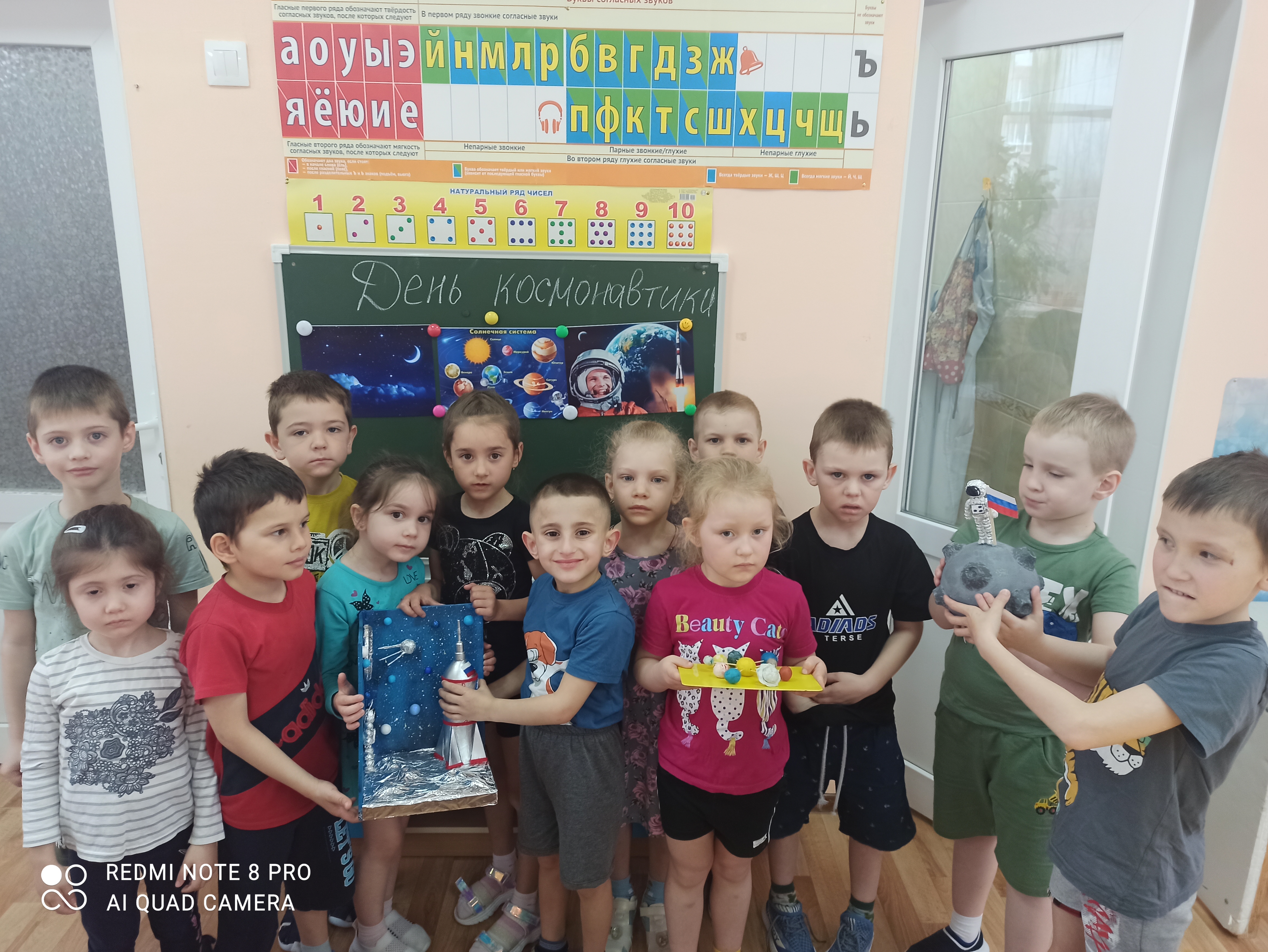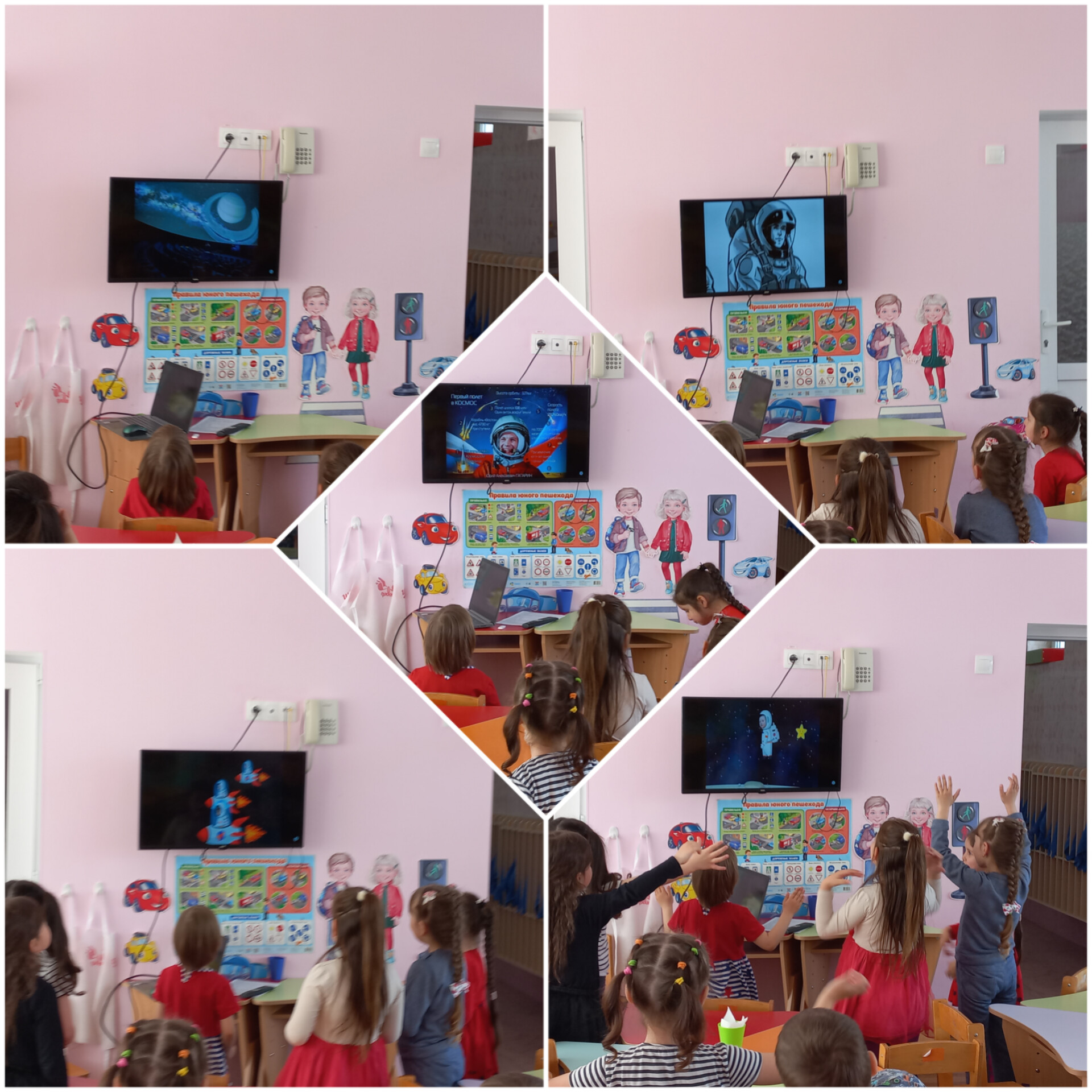 Дети с удовольствием отправились в космическое путешествие, участвовали в различных эстафетах и обратно вернулись в детский сад. Во всех группах детского сада эта тема красной нитью проходила во всех режимных моментах: "космическая зарядка", "Завтрак космонавта", "Гагаринский урок", "космические прогулки, игры, рисунки, плакаты, полеты в космос".
