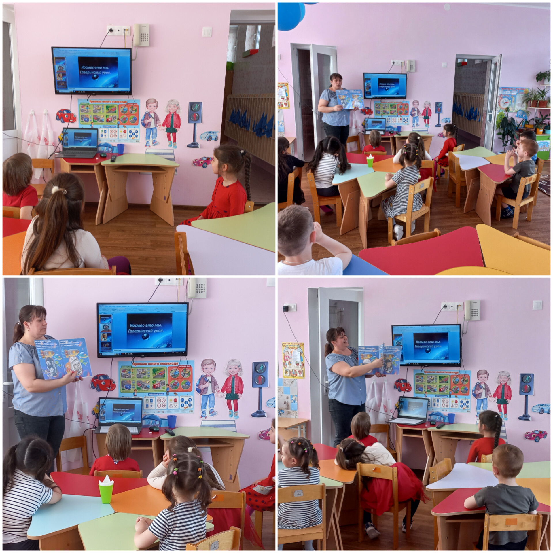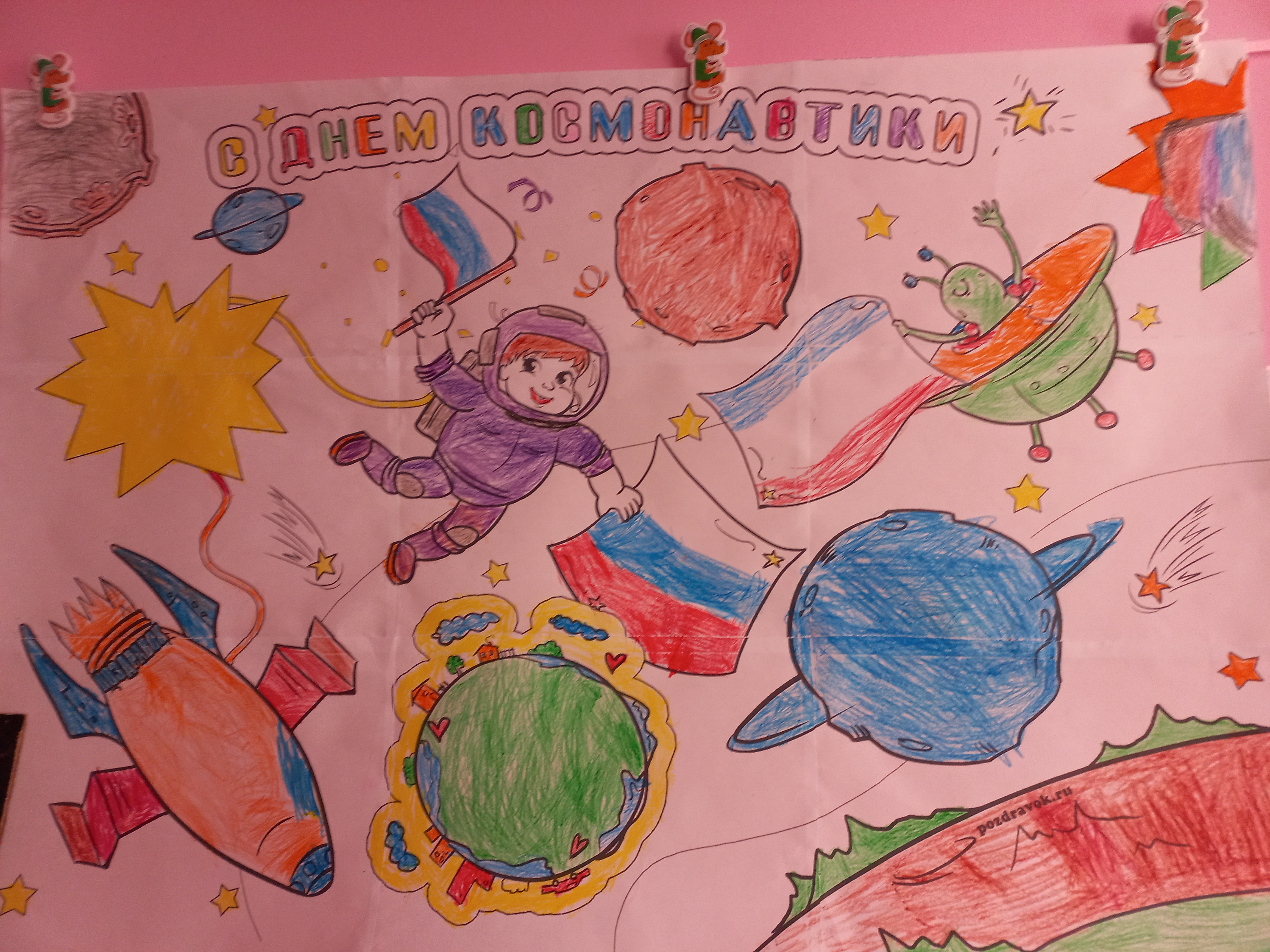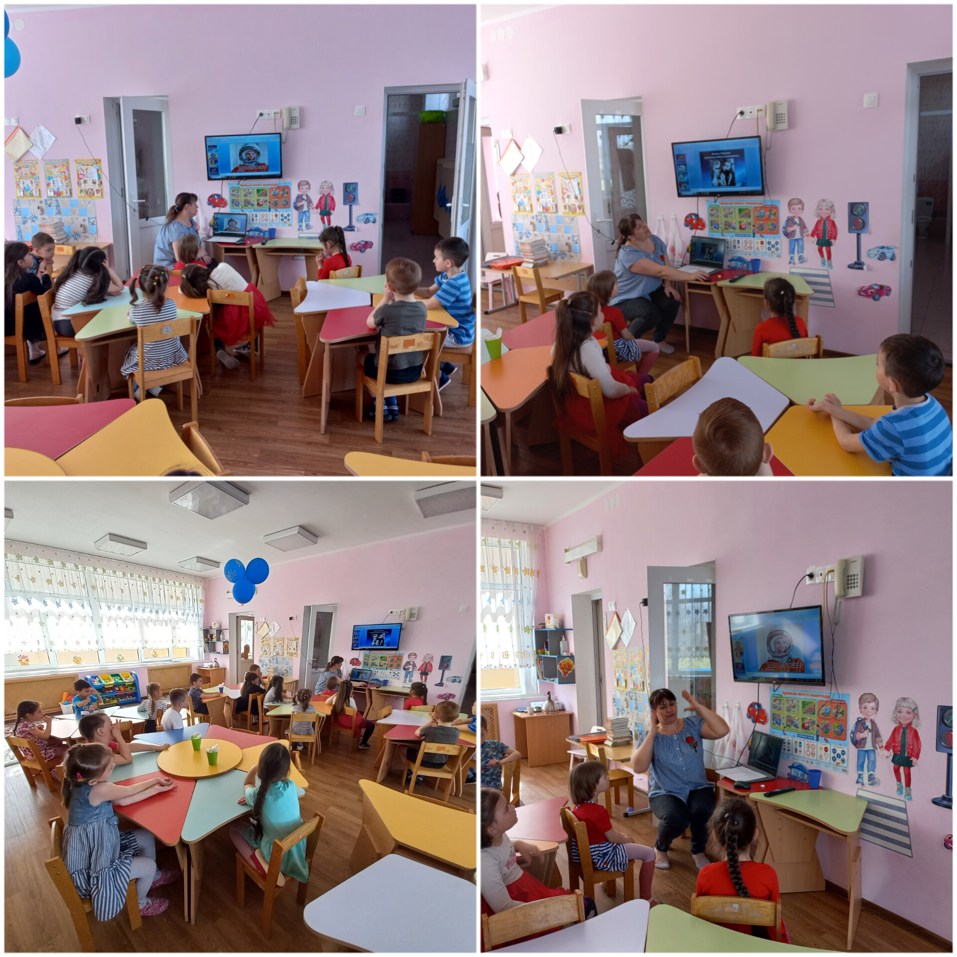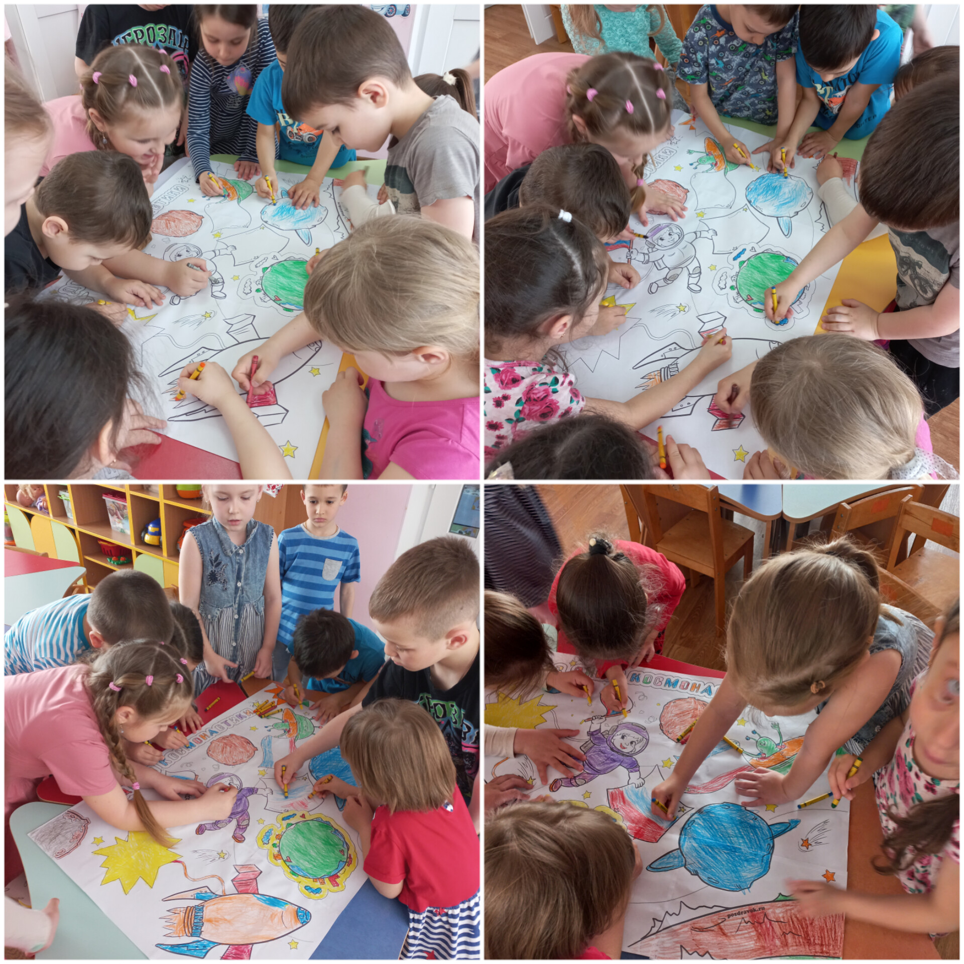 Дети с удовольствием отправились в космическое путешествие, участвовали в различных эстафетах и обратно вернулись в детский сад. Во всех группах детского сада эта тема красной нитью проходила во всех режимных моментах: "космическая зарядка", "Завтрак космонавта", "Гагаринский урок", "космические прогулки, игры, рисунки, плакаты, полеты в космос".