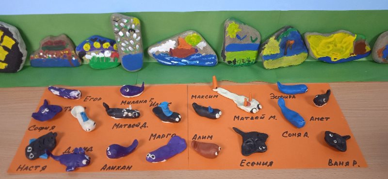 В группе "Бригантина" (воспитатель Юрова Л.Ю.) закончились тематические недели "Насекомые" и "Вода, ее свойства и значение". В течение этих недель ребята узнали, что такое круговорот воды в природе, вспомнили свойства воды, значение воды на человека и всего живого на нашей планете. Мы проводили опыты (поливали растения и проращивали зерна гречихи; рассматривали форму капелек воды; вспомнили, что вода может растворять различные вещества и смешивать краски; узнали, что вода и камень точит...). Вспомнили обитателей Черного моря и слепили их из пластилина. А еще рисовали на обточенных морем гладких камнях прекрасные фантастические рисунки.