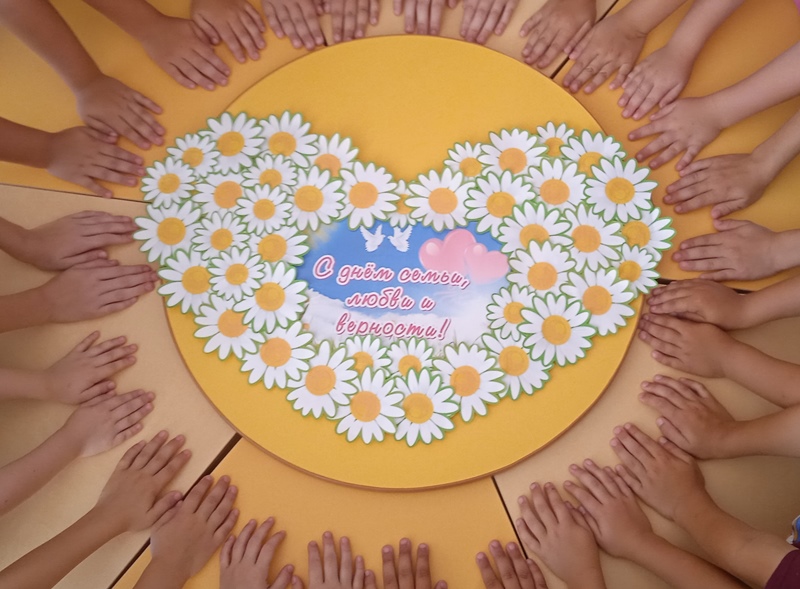 День Семьи, Любви и Верности отмечает Россия 8 июля. В преддверии этого праздника родители и дети группы «Бригантина» придумывали и рисовали гербы своих семей. А в группе мы создали коллективную работу и сфотографировались с ней.